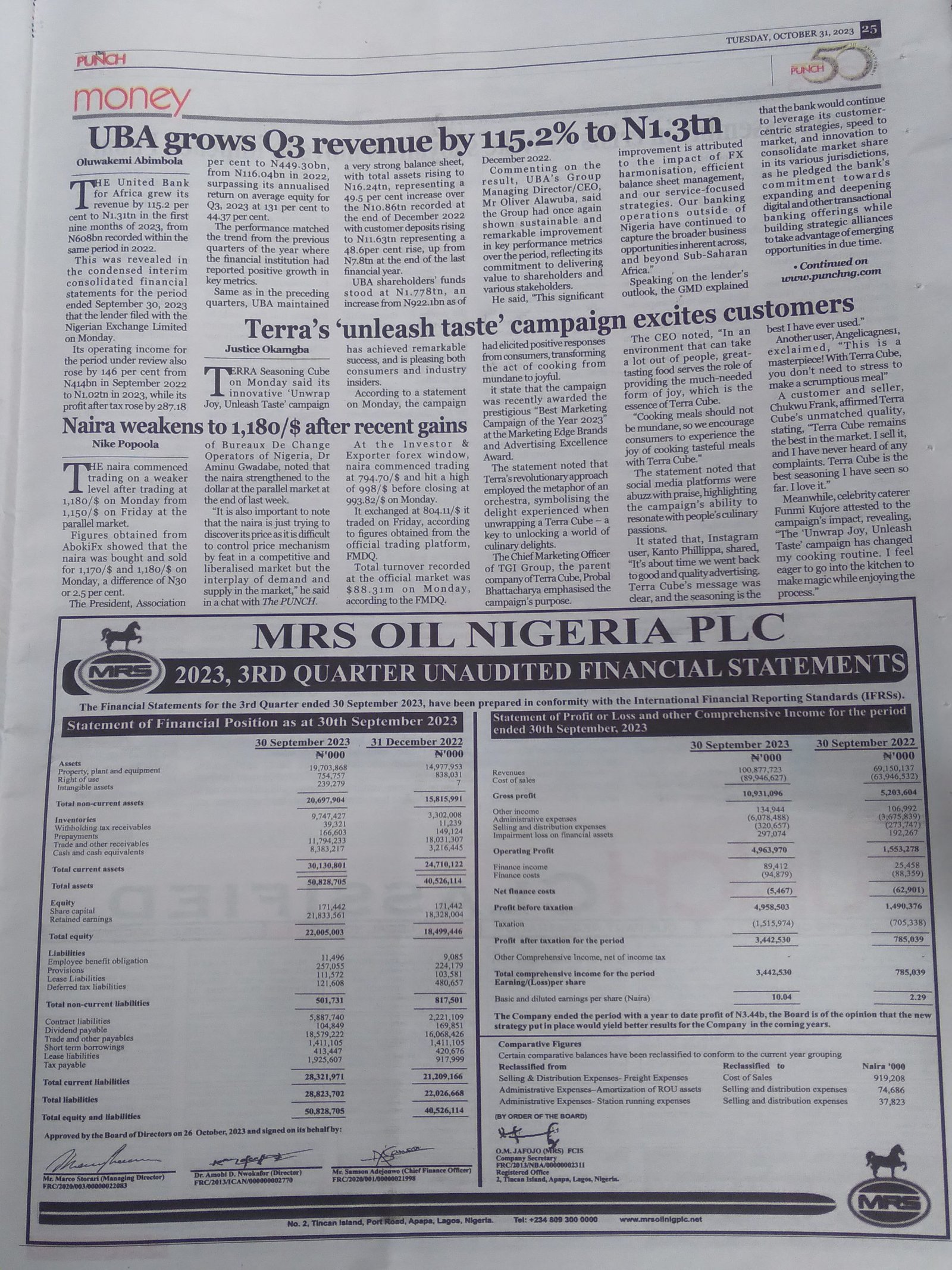 The Publication Notice of 2023, Q3 Unaudited Financial Statements – THE PUNCH