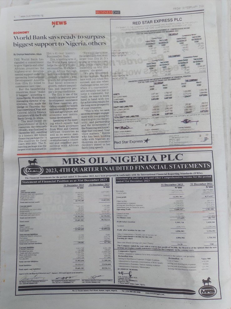 The Publication Notice of 2023, Q4 Unaudited Financial Statements – BUSINESS DAY